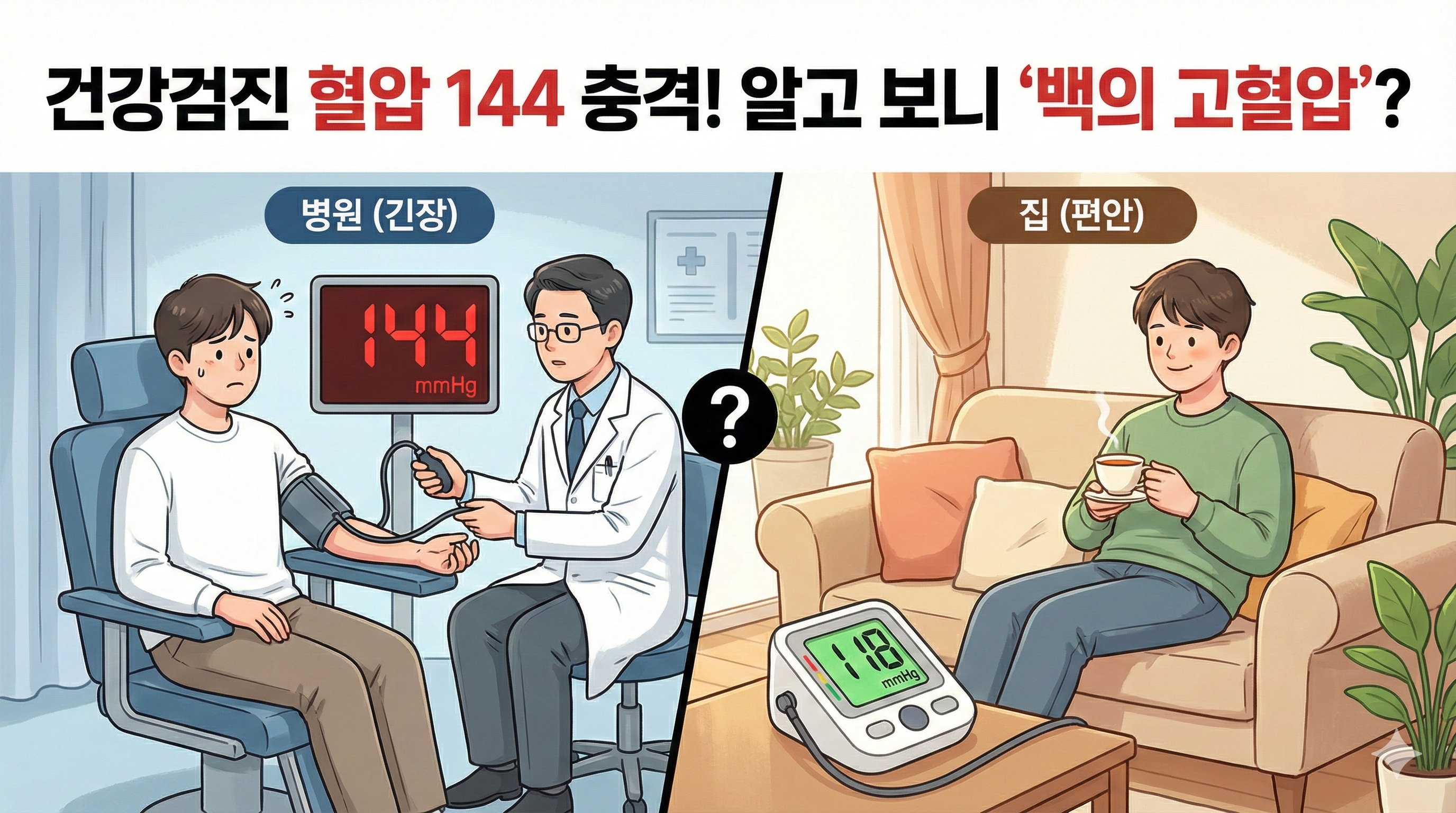 - 이유: 백의 고혈압은 '스트레스에 취약한 혈관'을 가졌다는 증거입니다. 평소엔 괜찮아도, 회사에서 화가 나거나 긴장하면 언제든 혈압이 150, 160까지 튈 수 있다는 뜻이죠.