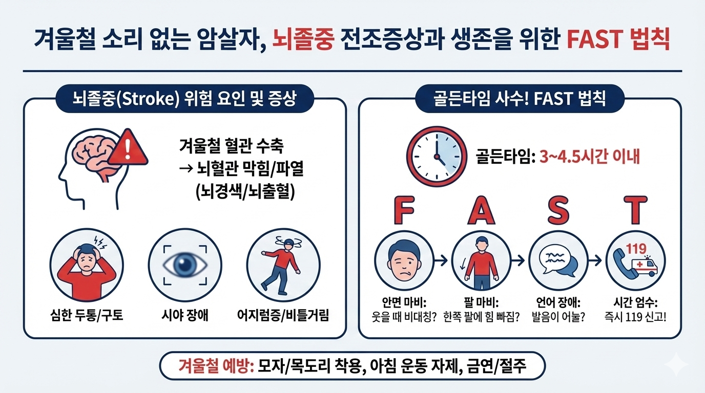오늘은 겨울철 불청객, 뇌졸중의 위험성과 생명을 구하는 FAST 법칙을 핵심만 짚어 정리해 드립니다.