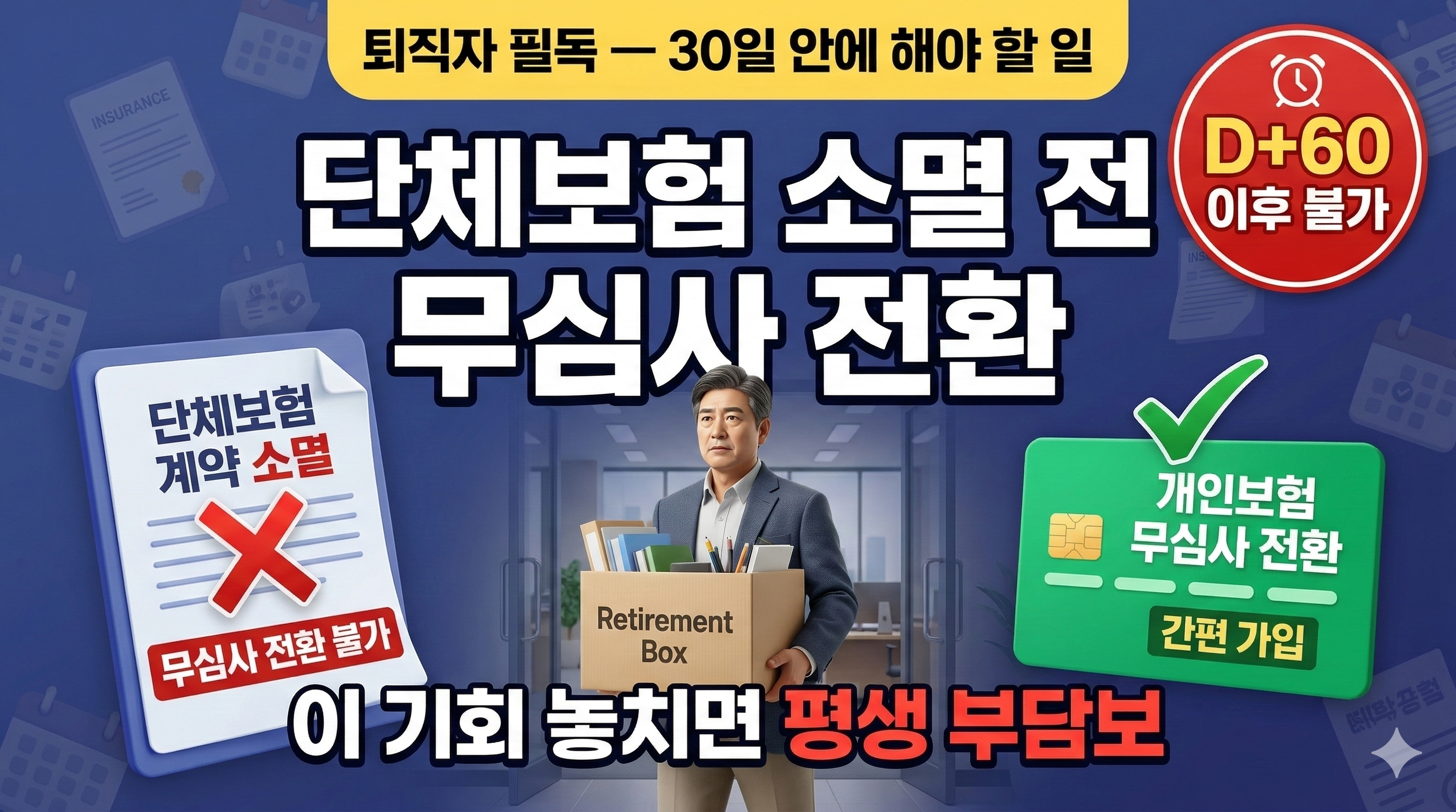 | D+60 이후 | 무심사 전환 기회 소멸 → 건강심사 필수 신규 가입만 가능 | 🔴 기회 소멸 |