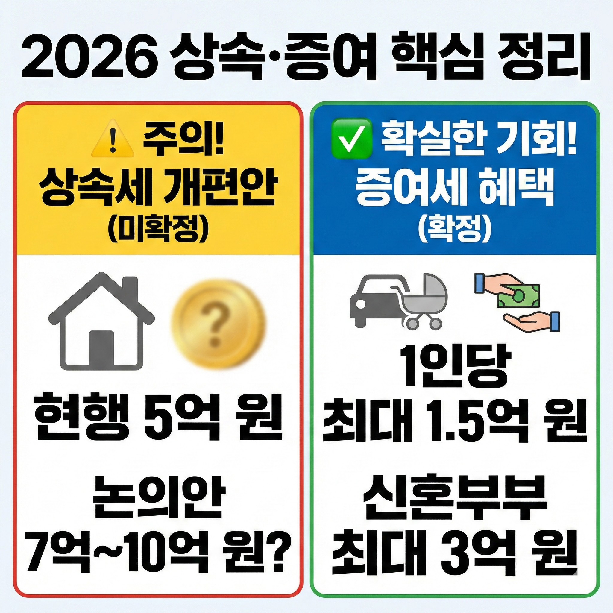 주의: 상속세 일괄공제 상향(5억→10억 등)은 아직 논의 중인 개편안입니다. 현재는 기존 5억 원 한도가 적용됩니다.