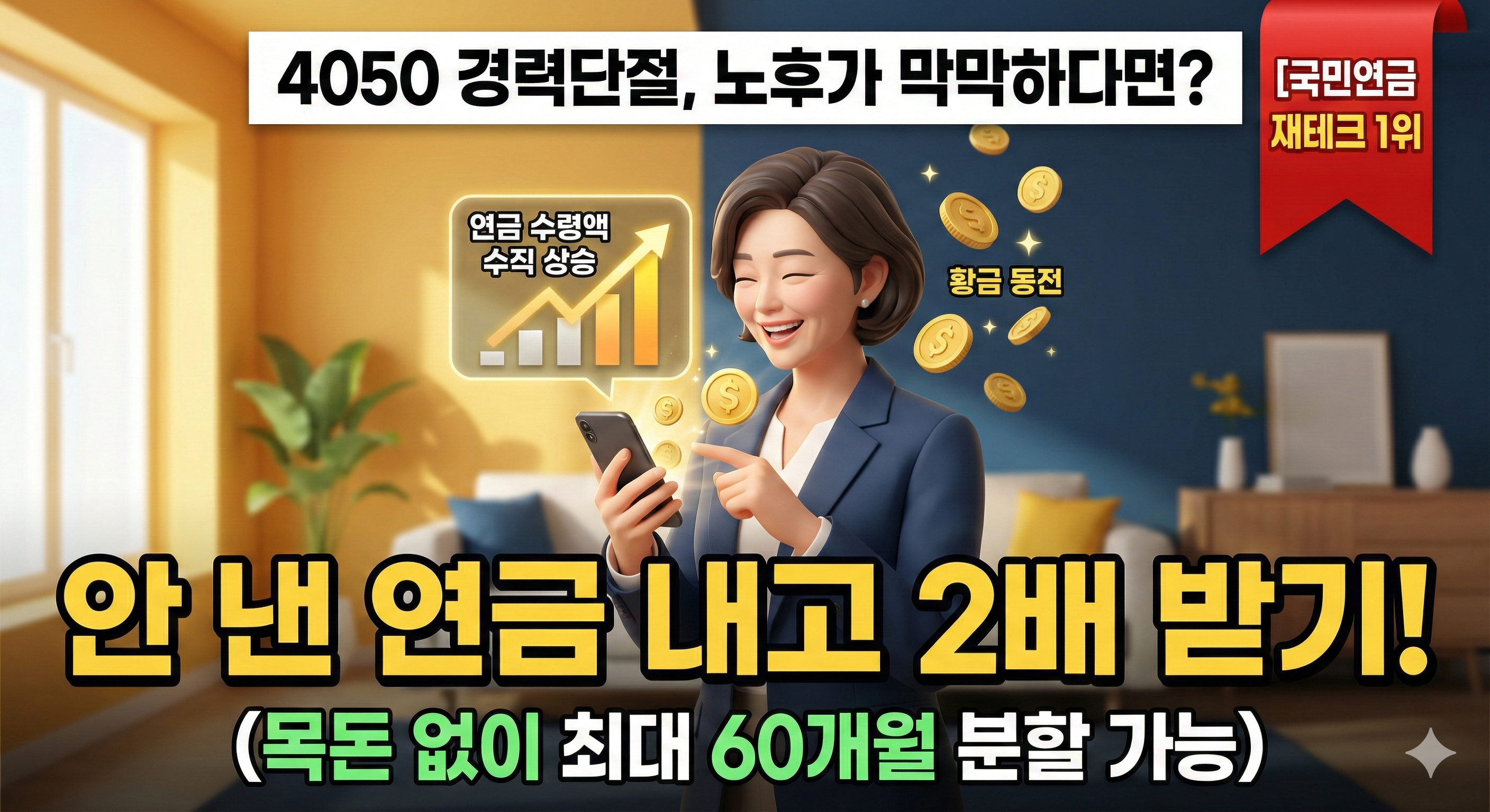 그 공백을 지금이라도 채울 수 있는 제도가 바로 국민연금 추후납부(추납)입니다. 수익률만 따지면 시중 어떤 금융 상품도 넘볼 수 없는, 국가가 보증하는 합법적 노후 재테크입니다. 2026년 기준 추납 수익률 시뮬레이션, 전업주부 임의가입 절차, 60회 분할납부 전략, 직장인 소득공제 꿀팁까지 한 번에 정리합니다.