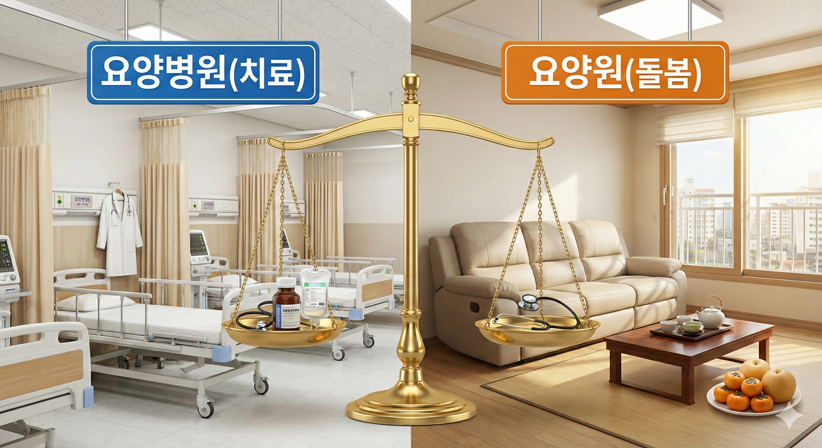 • 요양병원 (수리 센터): 고장 난 부품을 고치는 곳. 의사/간호사가 상주하며 '매일 치료'가 필요한 환자에게 적합합니다. (건강보험 적용)